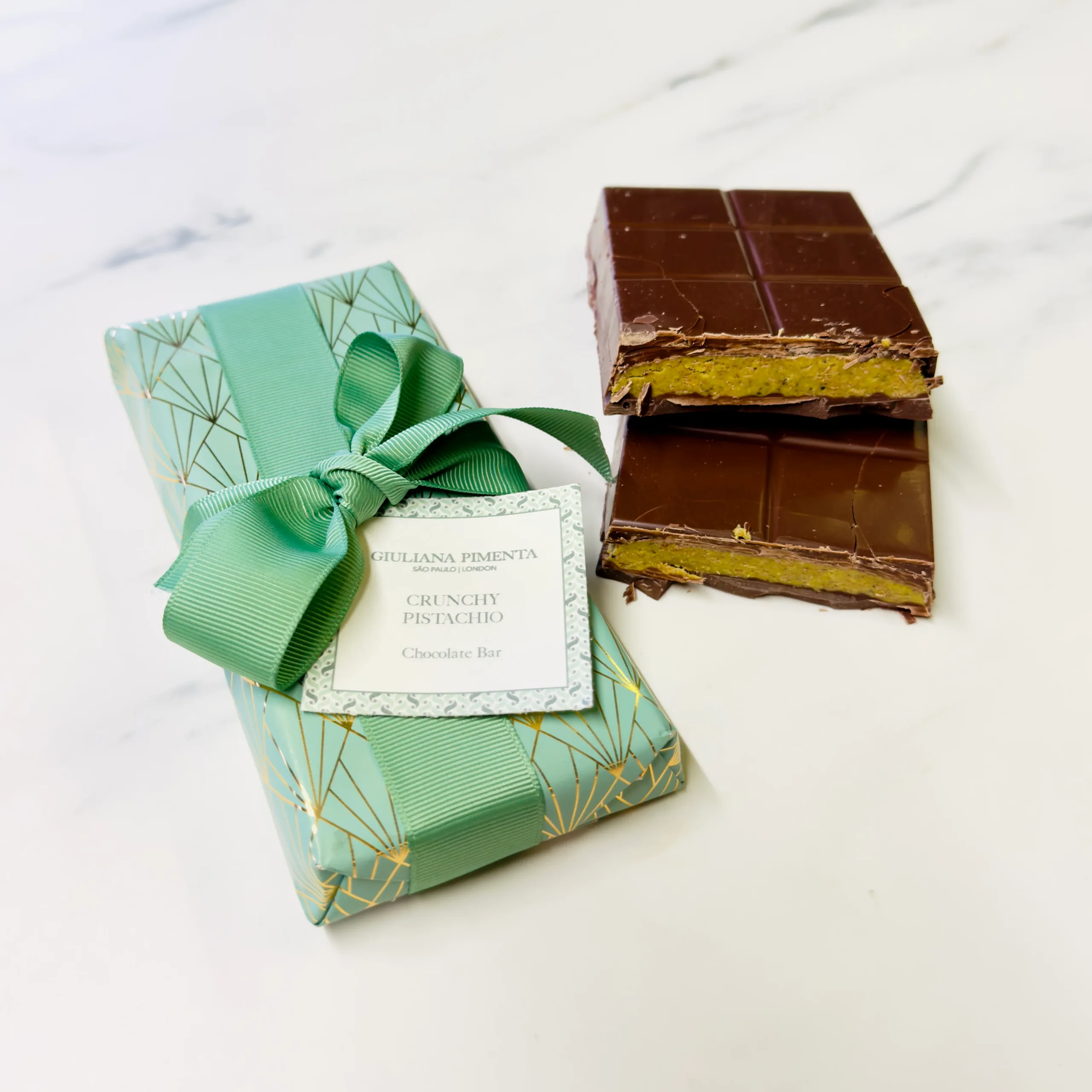 Oplev den perfekte harmoni af teksturer og smage i vores Crunchy Pistachio Chocolate Bar. Fremstillet med rig 41% mælkechokolade og overdådigt fyldt med Sprød pistacieganache, De er lavet af ægte ristede pistacienødder og karamelliserede vafler, der giver dybde, knas og autenticitet.