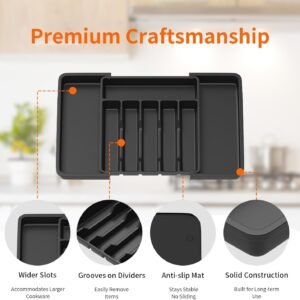 • Organize in Style & Sort Your Cutlery: This 8-compartment utensil drawer organiser allows you to categorize and neatly store your utensils, optimizing drawer space. Utensil drawer organiser allows you to easily recognise, identify & pick up the items you need for use. Simplify your kitchen organization with our plastic drawer organizer inserts that combine both style and functionality.