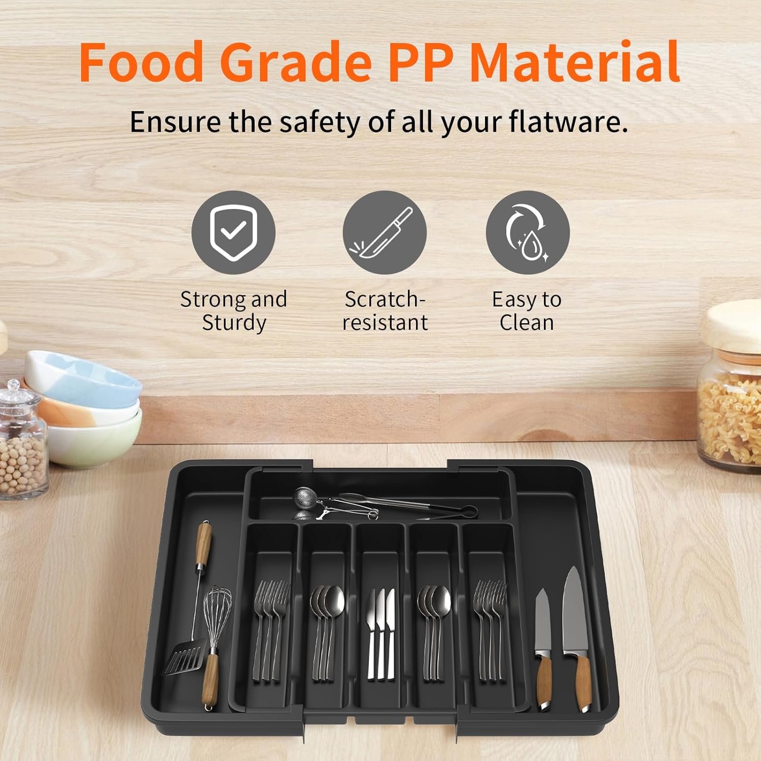 • Large Capacity: Organise your kitchen countertop and make more space with the cutlery drawer organiser. Comes with two expandable panels on the left and right to store more cutlery, utensils, and kitchen silverware.