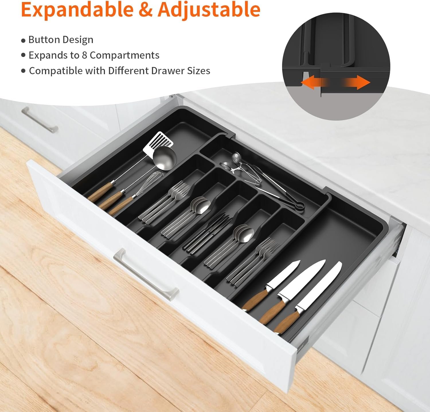 Cutlery Drawer Organiser, 33-57CM Expandable Utensil Tray for Kitchen with 8 Compartment Holders, Adjustable Silverware and Flatware Holder, Compact Plastic Storage Insert for Spoons Forks Knives